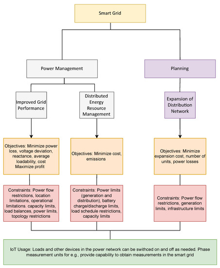 The electricity grid has been a major beneficiary of smart city technologies. The increasing demand for energy by consumers along with the environmental impact that fossil fuel-based energy production has on the planet has forced utility companies to introduce renewable energy sources within the electricity distribution system and make their energy production and distribution systems more efficient through planning and design improvements. Optimization algorithms find applications within the smart grid (SG) domain in terms of power management and planning. A summary of the applications, objectives, constraints and IoT useage for optimization algorithms in Smart Grids has been illustrated in Figure 3.