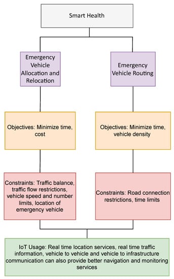 Smart health refers to the use of technology to provide better healthcare to patients. This can be in the form of developing tools for better diagnosis of diseases or the use of algorithms for better planning and healthcare delivery. The deployment of timely emergency vehicles to a person in need is imperative towards providing healthcare services to people. Two applications of optimization problems within Smart Health are emergency vehicle routing and their allocation and relocation as shown in Figure 4. It also summarizes the objectives uses, constraints considered and role of IoT.