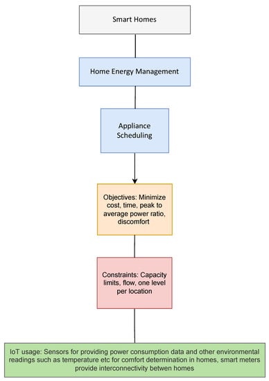 Home energy management has been the prime application of optimization in smart homes, a summary of the objectives, constraints and the use of IoT has been shown in Figure 5.