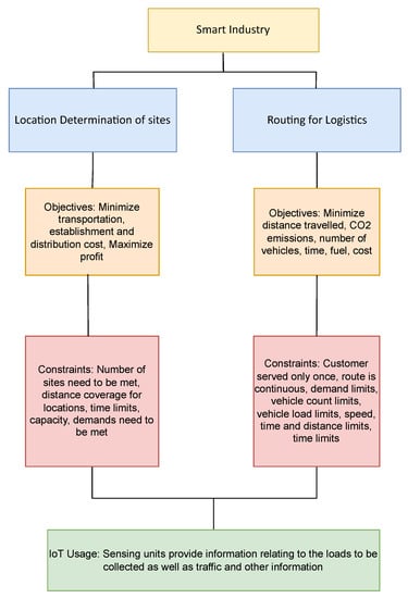 One of the biggest enablers of the Industry 4.0 concept has been the use of AI techniques to improve the efficiency of the manufacturing and production process. This has led to the development of cyber physical systems aiming to assist in activity recognition [97], machine health prediction [98] and production management in terms of bottleneck prediction [99]. Apart from conventional AI applications of anomaly detection, classification and regression, computational optimization also finds numerous applications as it fits well with the objective of efficient and streamlined manufacturing. The major applications for the use of computational optimization have been in the area of routing and location for logistics and are variations of the vehicle routing problem and are typically represented as Multidepot Vehicle Routing Problem (MVRP), Vehicle Routing Problem Pick-up and Delivery with Time Windows (VRPPDTW) or Large-scale Dynamic Vehicle Routing Problem (LSDVRP). Figure 6 summarizes the objectives utilized, constraints and the role of IoT in optimization for Smart Industry.