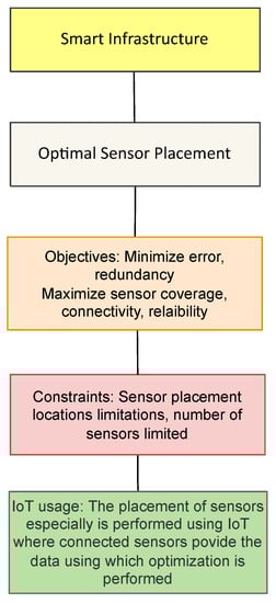 Within the infrastructure domain, the most common optimization problem is the area of health monitoring of structures. Structural Health Monitoring (SHM) is a necessary application within the smart infrastructure domain as it makes for safe usage of different structures of public use. These structures can be buildings as well as transport structures such as bridges, tunnels. Structural health monitoring typically involves the use of sensors attached to a structure at several points that can gauge some type of physical variable (vibration, strain, acceleration, temperature, tilt etc) from the structure. Data gathered from these connected sensors is then used to determine if any structural damage has taken place or not. Within the domain of SHM, optimization algorithms find application towards the Optimal Sensor Placement Problem (OSP) as illustrated in Figure 7. Figure 7 summarizes the objectives used, constraint and the use of IoT.