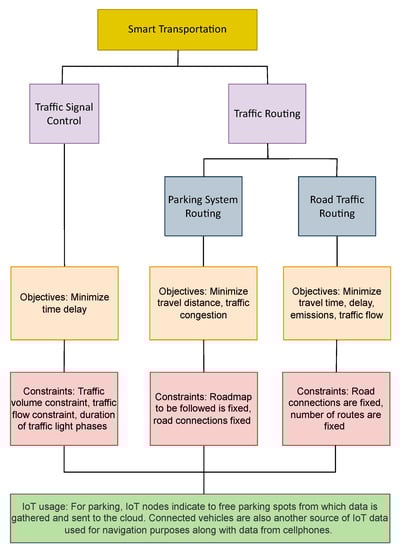 One of the most popular optimization applications within smart cities are within the smart transport domain. These include parking system routing, traffic signal control and scheduling. A summary of the applications, their objectives, constraints and the role of IoT is illustrated in Figure 8.