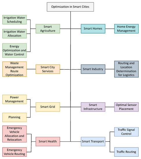 The increasing population and urbanization in the world has led to increased stress on cities around the world. With an estimated 70% of the worlds population living in cities by 2050 [1], governments and administrations are developing methods to cater to this increasing rise in their city’s dwellers. Moreover, the ever increasing effects of climate change and global warming have made necessary that these developments to the city’s capacity also be sustainable and environmentally friendly, following the United Nations Sustainable Development Goals for 2030 [2]. Considering these requirements, Smart Cities have become a topic of great interest by governments and the private sector worldwide. Smart Cities make use of technology to improve the living experience of the city’s inhabitants by contributing to important aspects of a city’s functioning. There are various domains within smart cities, these include Smart Agriculture, Smart City Services, Smart Grid, Smart Health, Smart Homes, Smart Industry, Smart Infrastructure and Smart Transportation. With improvement of Artificial intelligence (AI) capabilities in the last decade, there have been different applications of machine and deep learning algorithms within each of these domains [3] providing for better decision making and improvement of services. Apart from various supervised and unsupervised learning applications, several tasks within different components of smart cities can be formulated into optimization problems and/or require heuristics to be incorporated in some form. However, coverage of such efforts for IoT bases Smart Cities has received less attention compared to applications utilizing algorithms within the machine and deep learning domain.