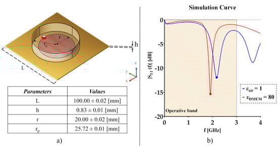 (a) Design and dimensions of the circular biosensor with the Petri dish; (b) Simulation response designed probe in the air (εair = 1.00) and in cell culture medium (εDMEM = 80.00), highlighting the operative frequency range of the VNA (0.001–3.000 GHz).
