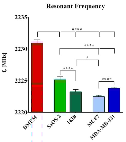 Resonant frequency values computed for pure DMEM, and the four tested cell lines: low-aggressive SaOS-2 and high-aggressive 143B osteosarcoma cell lines, and low-aggressive MCF7 and high-aggressive MDA-MB-231 breast cancer cell lines. n = 8. *, p< 0.05 and ****, p < 0.0001.