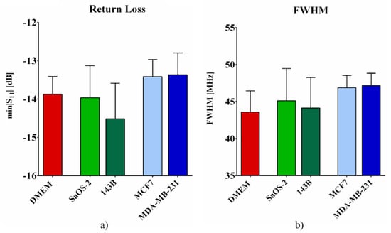 Figure 5 shows the min|S11 (f)| and FWHM values for all the tested groups. The results also reflect the fact that these two parameters were affected by a higher measurement variance than that reported for the resonant frequency.