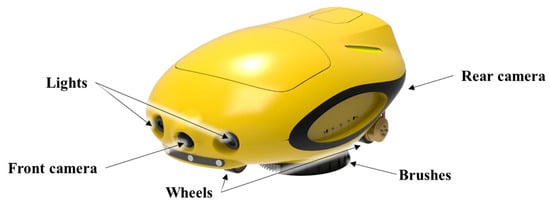 In this study, images of the hull surfaces were collected using the ROUV developed by SLM Global [45] to clean underwater hull surfaces, which is illustrated in Figure 2. The ROUV attaches itself to the hull surface and crawls along it using electrically driven magnetic wheels. It is remotely controlled and monitored by an operator through a tether cable. While moving along the hull surface, the ROUV brushes off the pollutants on the hull surface with two brushes installed at the bottom of the ROUV. The ROUV possesses one camera and two lights in the front and one camera at the rear. The front and rear cameras are used to check the condition of the hull surface before and after cleaning, respectively. The videos are recorded at 10 frames per second (FPS). Table 2 lists the main specifications of the ROUV.