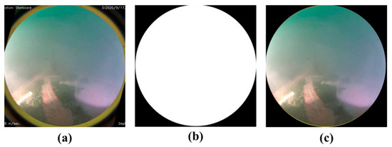 First, a rectangular area of 512 × 512 pixels containing the camera image was cut from the dashboard image of the ROUV to obtain an image of the camera region, as shown in Figure 3a. As the camera lens has a circular shape, its pure image also has a circular area. To use only the pure camera image, the circular portion is extracted using the Boolean intersection of the front camera image (Figure 3a) and mask (Figure 3b). The resulting image, shown in Figure 3c, was used for training.