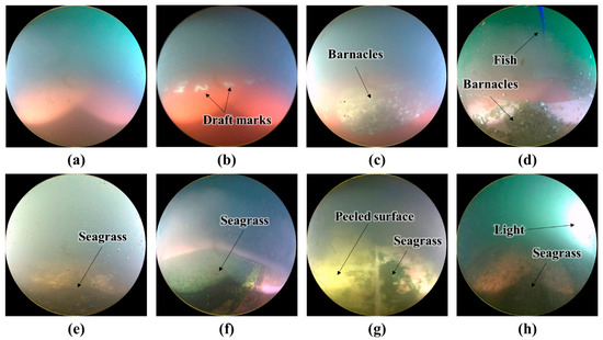 Figure 4 shows several images from the dataset. Figure 4a,b are clean images, and Figure 4c–h are unclean images. White draft marks are observed in the image in Figure 4b, barnacles are observed in the images in Figure 4c,d, and green mosses are seen in the images in Figure 4e–h. In Figure 4d, the tail fin of a fish can be seen, and in Figure 4g, the coating on the hull surface is shown to have been peeled off. In Figure 4e, the image is obscured by floating matter, and in Figure 4h, the lighting is too strong. As shown in Figure 4, underwater images include various objects, such as draft marks, fish, and floating matter. Furthermore, the underwater conditions such as lighting and the physical state of the hull surface vary. Thus, identifying the hull condition is difficult. Faulty classification due to similarity in colors of different objects is also a concern. For instance, draft marks, peeled sections of the hull surface, and barnacles are all generally white; however, only the images with barnacles should be classified as unclean.
