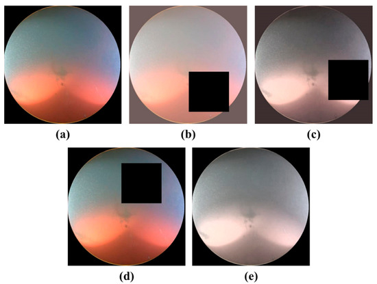 Examples of augmented images: (a) original image; (b) brightness, contrast, and cropping; (c) brightness, contrast, saturation, and cropping; (d) cropping; (e) saturation.