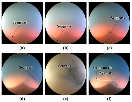 Figure 7 shows examples of the mis-classified images. Since Figure 7a–c only contain a small area of seagrass, the images were labeled as clean. However, the soft voting classifier seems to classify these images as unclean because of the seagrass. In Figure 7d, the dark colored seagrass and seawater overlap; consequently, the hull surface was erroneously identified as seawater. In Figure 7e, the seagrass was not correctly recognized owing to the disturbance caused by the floating matter. The image in Figure 7f has draft marks and seagrass; however, only the seagrass was recognized.