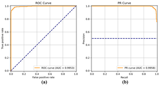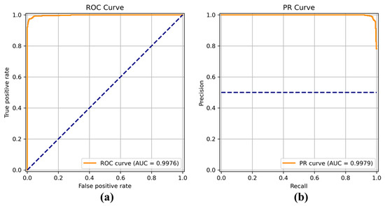 (a) Receiver operating characteristic (ROC) curve and (b) precision recall (PR) curve of EfficientNet.