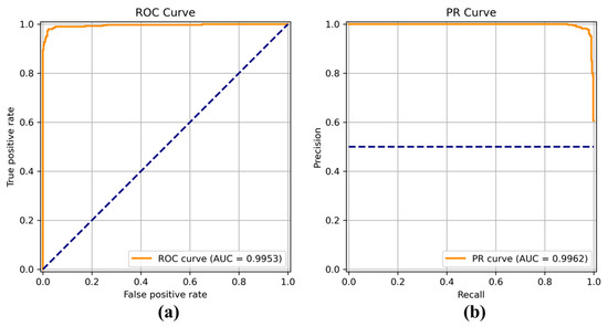 (a) Receiver operating characteristic (ROC) curve and (b) precision recall (PR) curve of MobileNet.