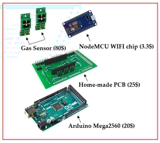 To detect gaseous pollutants in the environment, the authors developed a low-cost wireless gas-sensing device in the study. Figure 1 shows the low-cost Internet of Things (IoT) [36] device used in the research. It consists of four components: a gas sensor, a NodeMCU WIFI chip, a Homemade PCB, and a Arduino Mega2560. The gas sensor is a commercial component sold on the market, which detects the concentration of target gases, including CO, O3, and NO2. The sensors also detect the temperature and humidity in the atmosphere simultaneously. The Arduino Mega2560 stores the data detected by the sensors, while the NodeMCU WIFI chips upload the data stored by the Arduino Mega2560 to the cloud via the WIFI devices. The homemade PCB, designed by the author, integrates the interface of various electronic components, which reduces the occupied space and increases the stability of the component. The typical total cost of this device is 200 USD.
