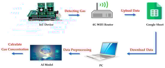 The IoT architecture divides into the perception, network, and application layers. As shown in Figure 2, the hardware of the perception layer is a low-cost IoT device responsible for detecting target gas concentrations and transmitting the detected concentration data to the network layer. The hardware of the network layer is the 4G WIFI router, which is responsible for receiving the information transmitted by the perception layer and uploading the received data to Google Cloud through the device. The hardware of the application layer is a personal computer. It obtains the information transmitted by the perception layer from the Google cloud and performs data preprocessing on the acquired data. The preprocessing process includes outlier cleaning, data normalization, and feature selection. Thus, the preprocessed atmosphere data transmits to the trained AI model using the IoT architecture for further gas concentration calculation.