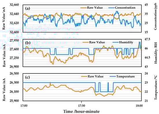 Raw values and corresponding physical quantities of (a) concentration, (b) temperature, and (c) humidity of the O3 gas sensor on February 1 2021 (17:00–18:00).