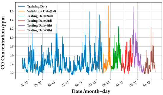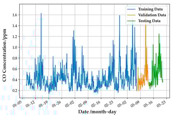 This study divided the data into three parts: the training and validation datasets in the training phase and the testing set in the testing phases. As an example, Figure 4 shows these three parts for the CO gas concentration. The blue, orange, and green lines represent the training, validation, and testing data. These sets do not overlap each other in time series to avoid the problem of data leakages in the model development. The training dataset is for the model training, it is validation data to be used for the hyperparameters’ adjustment by minimizing the validation error, and the testing set is to test the actual performance of the target gas model. All datasets in this paper were treated using this method to develop a high-performance model.
