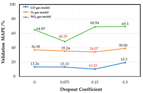 After this, the dropout layer coefficients of each gas model were determined. The dropout layer is a method used to improve model overfitting by shielding a certain percentage of neurons in each epoch, so that model training does not rely too much on specific neurons for training and prevents model overfitting [41]. By adjusting the coefficient of the dropout layer appropriately, the overfitting phenomenon of each target gas model on the training set can be effectively alleviated, and the performance of the verification set of each target gas model can be effectively improved. Figure 11 shows that, when the dropout coefficient is 0.15, the CO gas and the O3 gas models have the best validation set performance, with 10.25% and 34.07% MAPE, respectively. The NO2 gas model has the best validation performance when the dropout coefficient is 0.075, with 48.35% MAPE.