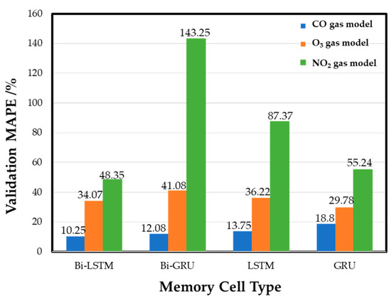 The memory cell used in the model is a vital model hyperparameter to be discussed. The recurrent neural layer uses the Bi-LSTM memory cell unit in the last section. More types of different memory cell units, including Bi-GRU, LSTM, and GRU, are compared based on their performance in the validation set testing. Figure 12 shows the experimental training results of different memory cells in each gas model. The results show that Bi-LSTM is the best cell for the CO gas model, with a MAPE of 10.25%. The other MAPE values are 12.08% for Bi-GRU memory cells, 13.75% (LSTM), and 18.8% (GRU). The performance of the O3 gas model is best (29.78% MAPE) when GRU is used, and the MAPE values are 34.07%, 41.08%, and 36.22% for the Bi-LSTM, Bi-GRU, and LSTM cells, respectively. In the NO2 gas model, Bi-LSTM shows the best performance in the validation set, and the MAPE is 48.35%. The MAPE values obtained by other memory cell training models are 143.25% (Bi-GRU), 87.37% (LSTM), and 55.24% (GRU), respectively. The results show that the gas models trained by different memory cells have various performances in the validation set. Basically, the commercial sensor’s native resolution limits the performance. The NO2 sensor has the lowest ratio of the average annual concentration to resolution, and thus the MAPE of the NO2 sensor model is always higher than the models of the other two gases. Compared with the CO gas model and the O3 gas model, the NO2 gas models have the most considerable performance variation while different memory cells are used. Subsequently, by integrating each gas model trained by four different memory cells, an ensemble model can be retrained to be the best model for gas concentration detecting.