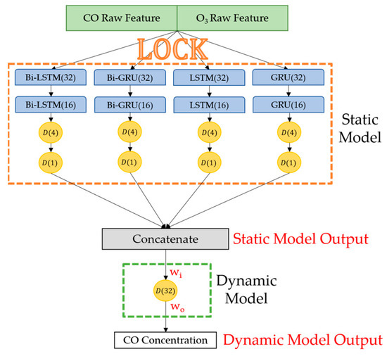 Ensemble models are proposed in this study to reuse all the single weak models trained in the last steps. Figure 13 shows schematic diagrams of the ensemble models for CO gas; models for detecting O3 and NO2 gas are constructed in the same way. The orange dashed line in Figure 13 indicates the four types of recurrent neural models trained in Section 4.2. These recurrent neural models are integrated, and their parameters inherited from the last step are frozen in the ensemble model; thus, it is named a static model. The green dashed line in Figure 13 highlights a fully connected neural network responsible for receiving output values and training data from the static model and then determining their parameters through backpropagation. Since the weight coefficients (wi and wo in Figure 13) will change in the further retraining procedure, this NN is named the dynamic model. The dynamic model learns the deviation relation of different RNN models through retraining, summarizes the target gas concentration calculated by the static model, and outputs the final summarized target gas concentration value.