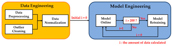 The flow chart of an optimal gas model is set out in Figure 15. Data engineering is the first step in dealing with a new dataset, including preprocessing, outlier cleaning, and normalization, as mentioned in Section 2. The second step, model engineering, contains a recursive work—model online, performance monitoring, and model retraining. We obtained the best ensemble model through a training series, as shown in Section 4.1, Section 4.2 and Section 4.3. Then, the model was activated to calculate gas concentrations; this model was named model online. Under regular monitoring, the model’s performance declined with time; therefore, the program counts on the amount of data that the model has calculated and decides whether to retrain the dynamic model. While the amount of data calculated by the model reached two hundred, model retraining was triggered in the study. The testing dataset became a new training dataset in the retraining procedure. The upper and lower limits of the scaling scale of the new training dataset were consistent with the original training dataset to ensure the consistency of the new and old datasets. We used the new training dataset to train the dynamic model again and then updated the weight coefficients (as shown in Section 4.3). By periodically updating the dynamic model’s weight coefficients, the gas model’s performance at each stage is stabilized and extends the gas model’s life cycle.