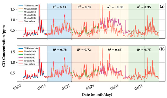 The performance comparison of the (a) original model and the (b) retrained model of the CO gas ensemble model at different periods. The true values of concentrations were from the EPA’s database.