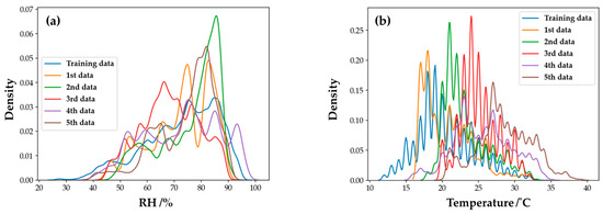 This study discussed the feasibility of using IoT gas sensors in a natural atmospheric environment. According to the Kernel Density Estimation (KDE) [42] of humidity and temperature, as shown in Figure 19, our sensors were in a rapid-change humidity and temperature environment instead of a constant temperature/humidity chamber in a laboratory. Under these varying conditions, our ensemble model can still maintain a relatively stable performance. The ensemble machine learning model can apply IoT sensors to achieve accurate air pollution detection.