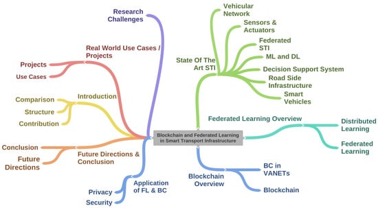 Section 1 presents the detailed introduction of the proposed survey that includes survey contributions and structure. Section 2 presents the state-of-the-art smart transport infrastructure from a VANET environment perspective that includes smart vehicles, roadside infrastructure, vehicular network, support decision networks, sensors and actuators, federated STI, and ML and DL concepts. Section 3 presents FL, distributed learning, and FL integration in VANET. Section 4 presents blockchain and its integration with FL in VANET. Section 5 presents the existing applications of FL and blockchain in the VANET environment from a security and privacy perspective. Section 6 presents real-world projects associated with the VANET environment from a security perspective. Section 7 presents research challenges regarding FL and blockchain integration along with possible future research direction from the FL and blockchain perspectives in the VANET environment. Section 8 summarizes the proposed survey. Figure 1 depicts the context of the proposed survey.