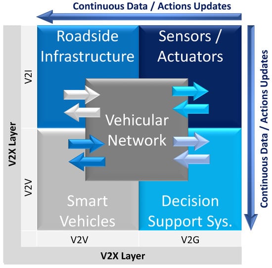 Sensors and actuators in STI are divided into many categories. There are in-vehicle sensors that monitor different aspects of the vehicle like speed, temperature, the status of different internal systems, power, engine oil, transmission, propulsion, radar, laser range finders, navigation, and obstacles [57] as well as externally placed in RSUs for monitoring the infrastructure and vehicles traveling on these infrastructures like traffic flow monitoring, accident tracking, automated parking systems, context awareness, and safety and security measures monitoring [58,59].