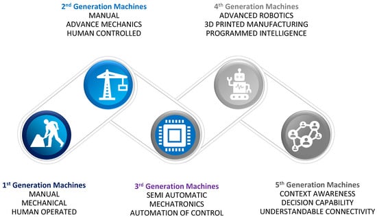 Machines are meant to do specific tasks in a distributed mechanism [49]. In such phenomena, immense duties may be accomplished faster by employing more machines instead of a reduced number of machines. Optimization is accomplished by adjusting the ratio of the advantages acquired from early completion in relation to the cost of machine operations. Machines were initially designed to be static and serve only a single function. Afterward, advancements were made to these machines in the second generation, allowing machines to tackle comparable tasks with a single instance. Electronic advancements and the advent of chips have greatly enhanced the current lifestyle, and the third generation of machines has increased control, accuracy, and automation. Design, awareness, and intelligence are all significantly improved in fourth-generation machines. 3D printing, nanotechnology, and artificial intelligence make it easier for people to be replaced by machines in activities that demand much effort and/or are conducted in hazardous situations. The interconnected, context-aware, decision-making intelligent machines that will drive the progress into the fifth generation are the emerging trend in this sector [50,51]. Figure 3 shows the overview of the evolution of technology in machines.
