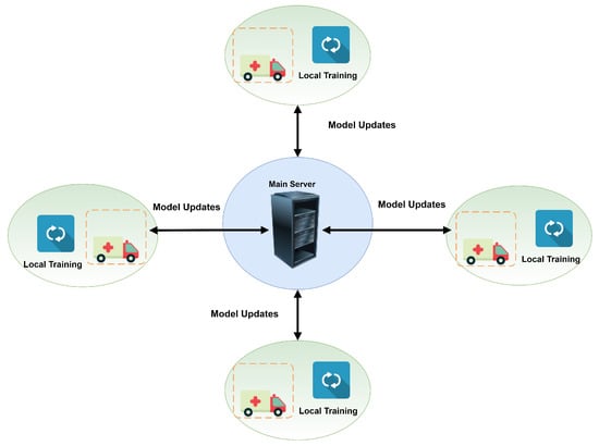 FL has been considered in critical networks to handle the centralized data problems (e.g., VANET) as a solution. It is a sort of distributed ML model with benefits of AI-based end-devices computation applications, such as smart cars, and also guarantees the privacy of end-users [69,70]. The ML/DL model is trained globally and distributes the updated parameters to end devices’ via the centralized server to start the process in FL. With the assistance of this trained model, all end devices train their local model of ML/DL on their local data. Clients send the parameters to a centralized server for global training upon training the local ML model. To fulfill the demand and precision of centralized servers, the operation is repeated multiple times until it is all done. There are several applications, such as e-commerce and e-healthcare, where FL can be conveniently deployed [69,71], as is shown in Figure 4.