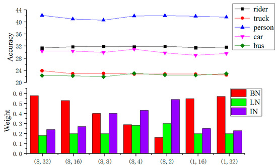 For various batch size, the segmentation accuracy of different types of targets is basically stable, as shown in the top portion of Figure 3. For instance, the segmentation of persons is about 42%. The rider and car targets are relatively close, stable at about 32%. The trucks and buses are around 22%. This means that, under the proposed SN method, regardless of the sample batch sizes, the segmentation has a stable accuracy. Under the same configuration, the improved self-adapting normalization performs very stably.