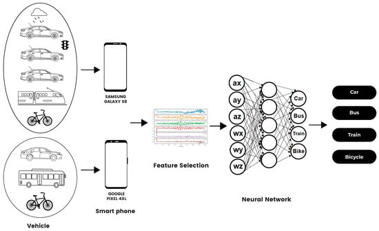 Data were taken from the two cell phones onboard the vehicles. A total of two types of devices were used to diversify and mitigate the bias of specific mobile devices. In the Samsung Galaxy set, the Honda Insight was driven in the rain and in traffic, as well as on clear highway roads, for comparison. To determine that the vehicle set and smart phone model were not determining factors, the two sets were processed with the same feature selection and neural network, and ultimately categorized as car, bus, train, or bicycle.