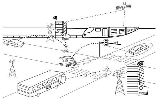 The ability of smart device sensors to connect and integrate with other sensors within an intelligent transportation system network, therefore, creates the potential for higher levels of interconnectivity, information, and interactivity throughout the transportation grid. Driver behavior can be tracked by smart phone sensors, with the potential of understanding the cause of, or even avoiding accidents [53]. A pedestrian is also able to know in real-time the arrival time of the bus and train. The traffic light can anticipate the pedestrian’s and bicyclist’s approach, potentially readying its signal to best accommodate them. A smart road can identify, track, and interact with the pressure or magnetism from the connected car above it, monitoring and interacting with vehicles in real-time. In the communication between all these modes of transportation, the traffic light and public transportation system, as well as any potential autonomous vehicles, are able to adjust to traffic conditions and/or accommodate the emergency vehicle’s need to race ahead and bypass any traffic conditions. Smart buildings, as shown by the corporate offices in the system, are similarly connected to all these systems, allowing them to adjust to changing conditions if any advantages can be elicited from doing so. Lastly, the entire grid of the urban center is connected to all other urban centers, surrounding traffic lights, bus stops, and train terminals, by the ubiquitous connection of stop lights, cell phone towers, people carrying devices with smart sensors, and GPS satellites, to better control and automate intelligent transportation systems.