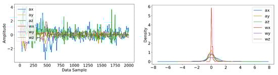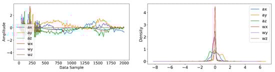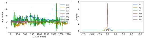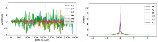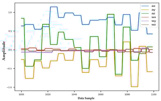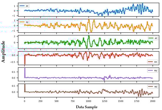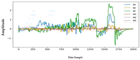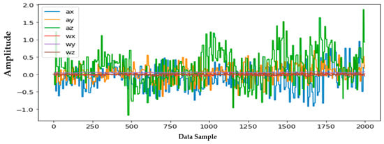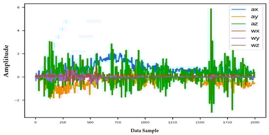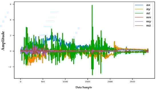 Information from every vehicle type was obtained for 5 min each at separate times. A 3-axis gyroscope and accelerometer were used. The x, y, and z figures of the gyroscope, as well as that of the accelerometer, were collected. In our dataset, we therefore had six columns of information. Each time stamp represents a point in the data. Figure 6, Figure 7, Figure 8 and Figure 9 visualize the raw sensor signals for the Toyota Camry, Honda Insight, bus, and bicycle, respectively. The data are labeled with the same abbreviations as listed in the training data set, and color coded to highlight differences among the various vehicles more easily. Both car models were registered as “car”, and were easily distinguished against bus, bicycle, or train.