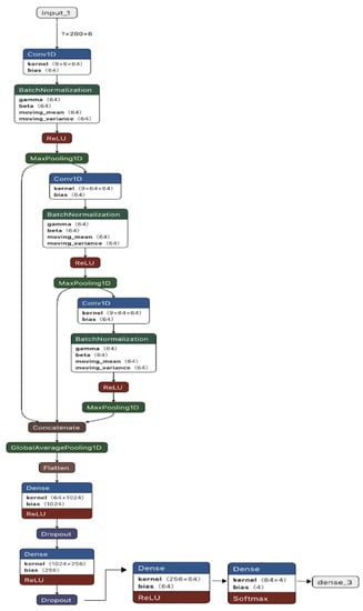 A combination of smartphone sensors, including GPS reception, GPS location, Wi-Fi, and GSM tower scans data were analyzed with a combination of convolutional subnets to extract local features, as well as a transformer subnet that captures long-term dependencies. Ref. [38] distinguished between users standing still, walking, running, cycling, driving a car, or riding a bus, subway, or train to yield a best F1-score of 0.8779. The use of GPS sensors in [36,37,38] provides less specific displacement sensitivity than the gyroscope and accelerometer used in our study, a difference that can at least partly explain our higher accuracy of 98%.