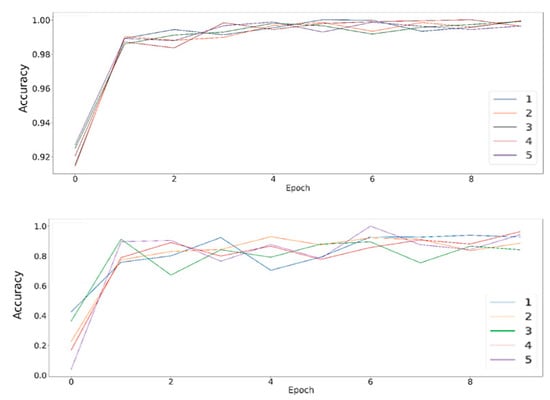 Accelerometer, gyroscope, and magnetometer sensors were used for interpreting driving activities, including stopping (S), going straight (G), turning left (L), or turning right (R), while either walking, biking, motorbiking, driving a car, or riding a bus [30]. Authors achieved an accuracy of 98.33% in detecting vehicle modes, and an average accuracy of 98.95% for identifying driving events. In another study using accelerator, gyroscope, magnetometer, and barometer sensors, Ref. [31] distinguished between bus, car, metro, and train transportation modes. The authors’ CNN algorithm had the highest accuracy of transportation mode recognition when based on a Keras framework, yielding an accuracy of 94.2%. While the results of Refs. [29,31] had lower accuracy than ours, Ref. [30] was more comparable to the success of our model. However, this slightly higher accuracy required additional magnetometer data [30] to our more cost-effective accelerometer and gyroscope model.
