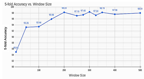 With deep convolutional bidirectional-LSTM, which is a method combining convolutional and bidirectional LSTM layers, Ref. [6] predicted whether users were traveling by car, bus, train, subway, walking, running, biking, or remaining stationary by analyzing the raw data of smartphone sensors. Accelerometer data, gyroscope data, magnetometer data, linear acceleration, gravity data, orientation (quaternions), and ambient pressure were utilized to achieve an F1 score of 0.96, but found that train and subway data were more difficult to distinguish, a problem that they were able to mitigate through the inclusion of GPS location data. Ref. [7] utilized LSTM to analyze Wi-Fi, GPS, LTE, and CDMA receivers from smartphones for identifying whether people were either not moving, walking, running, riding a bike, driving in a car, on a bus, on a train, or taking a subway. Four-fold shuffling was used to test the pipeline on the validation set with random shuffling, arriving at a best shuffle F1 score of 84.07%. Both Refs. [6,7] required a greater number of sensors, and also obtained lower accuracy than our 98% accuracy with only two cost-effective smart device sensors.