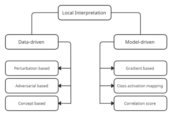 Data-driven and model-driven explanations are the main categories of local interpretation methods [51]. For example, model-driven methods investigate the inner components of ML models, which do not need a global interpretation of the inner-working methodology of the model. The explanation depends on a category to interpret how the model performs a provided task. These models are computationally inexpensive and convenient to implement. Moreover, these models are subdivided as such into a class activation map [52,53,54], gradient-based interpretation [55,56], and correlation-score interpretation [57,58,59,60].