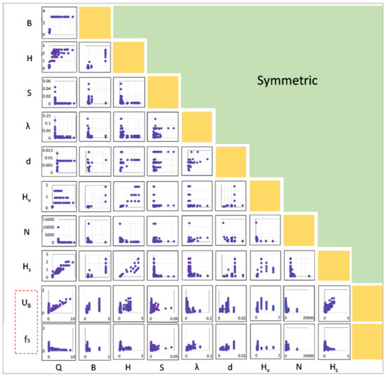 However, previously introduced equations (to predict UB) do not consist of Q and more often ‘d’. In addition, the term H can be linearly expressed as Hs + HV. Therefore, we neglect parameters Q, d, and H for the ML model. UB is supposed to be a function of S, λ, B, HV, N, and HS. Equations (8)–(14) are several existing regression models developed to predict UB. Shi et al. [4] assumed that fS = g(S, λ, H/HV, and aHV), where a = 4λ/d. However, the solution they obtained only consists of λ (refer to Equation (15)).
