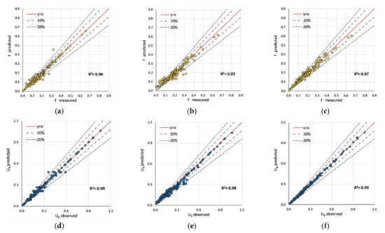 The data set is simultaneously used to: (a) predict fS (friction coefficient in the surface layer) and (b) predict UB (bulk average velocity). From the experimental data, the following Equation (4) was used to calculate UB. All parameters are presented in Table 1. Equation (5) was used to calculate fS.