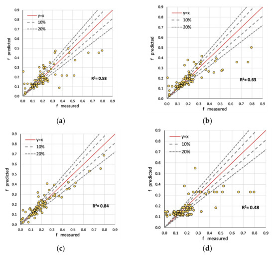 Comparison of validation accuracies of predicted fS: (a) decision tree regressor; (b) extra tree regressor; (c) XGBoost regressor; (d) Shi et al. [4].