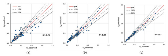 Figure 6 depicts the validation predictions (UB) obtained from different models. The first row consists of the ML predictions, whereas the latter consists of those of the existing regression models. Among the models, the highest accuracy was obtained for the XGBoost (R2 = 0.97) model, and the lowest was obtained for the decision tree model (R2 = 0.78). Given the conclusions of Shi et al. [4], the model proposed by Huthoff et al. [8] fits better with the validation set. The equation from Cheng [5] achieved an R2 of 0.92. Compared to Huthoff’s model, XGboost shows fewer deviations in predictions. For example, 0.3 < UB < 0.6 regions consist of inconsistencies as shown in Figure 6f. However, the observed inconsistencies are inferior to the XGBoost model. The two equations proposed by Shi et al. [4] and Cheng [5] provide conservative values compared to Huthoff’s equation.