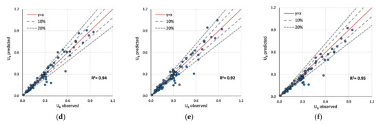 Comparison of validation accuracies of predicted UB: (a) decision tree regressor; (b) extra tree regressor; (c) XGBoost regressor; (d) Shi et al. [4]; (e) Cheng [5]; (f) Huthoff et al. [8].