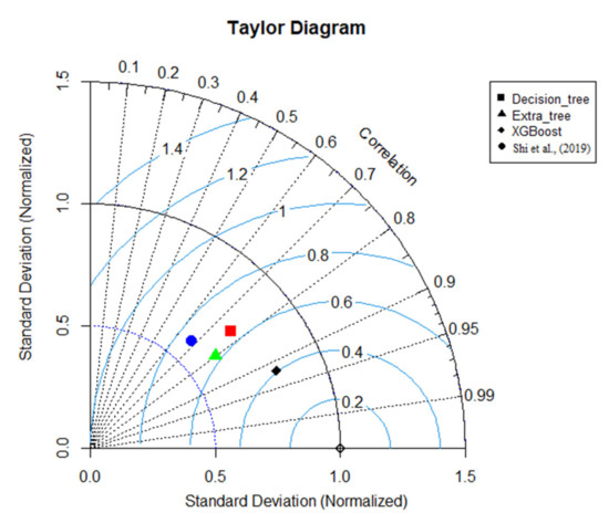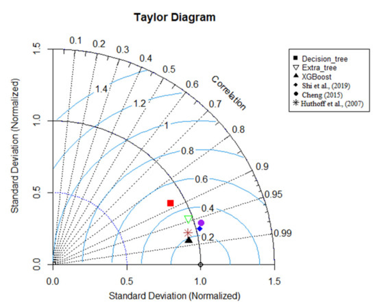 However, the extra tree and decision tree were not perfect for predicting fS. Still, those three models are superior in contrast to the equation proposed by Shi et al. [4]. For instance, Shi’s equation obtained the highest MAE and RMSE values (0.069 and 0.11). Compared to UB predictions, the fS predictions achieved moderately less accuracy, despite the XGBoost predictions. XGBoost obtained an R2 value of 0.85 and an MAE value of 0.042 for validation predictions. Moreover, it captured variation better than the existing equation. Figure 7 and Figure 8 show Taylor diagrams of validation predictions for both occasions. Accordingly, the XGBoost model is superior to the other models in both tasks with a strong correlation. However, for UB predictions, Huthoff’s model is also comparable, but slightly less accurate, in contrast to the XGBoost model.