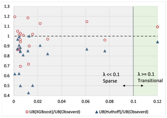 In addition, Belcher et al., [17] and Nepf [15] introduced three flow regimes based on λ. According to the current data set, λ << 0.1 will be considered sparse vegetation, whereas λ ≥ 0.1 is considered transitional (note λ > 0.23 dense). We intend to compare the XGBoost predictions and Huthoff’s predictions according to these flow regimes (refer to Figure 9). Since the analysis of this study emphasized that Huthoff’s model is superior to existing regression models, it is observed that XGBoost consists of a higher prediction accuracy (with lower deviations) in sparse vegetation conditions. In the same regime, deviations of up to 60% can be expected from Huthoff’s regression model. However, from sparse vegetation to transition regime, both models show a comparable prediction accuracy for UB.