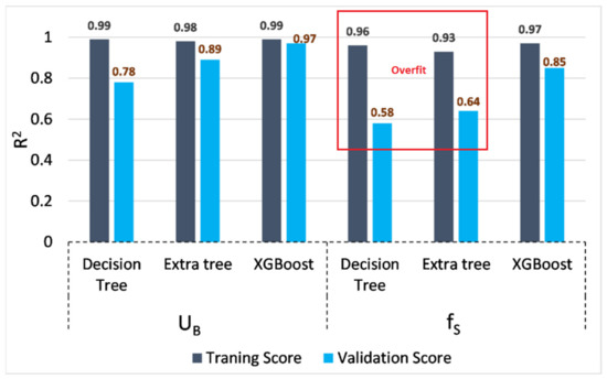 As previously mentioned, ML models can overfit a training data set, which can result in higher and lower prediction scores for training and validation sequences, respectively. Therefore, the authors examine this drawback using the R2 score of training and validations (refer to Figure 10). Accordingly, all three models are acceptable for predicting UB with rigid vegetation. However, the decision tree’s and extra tree’s performances are suspicious for predicting fS. For example, the gap between validation and training scores is significant for both these models. Therefore, considering abrupt changes in the decision tree and extra tree when predicting fS, the authors do not recommend these two models to obtain further validation predictions. However, the validation scores were better than the observed score for Shi’s equation. On one hand, it shows the unique prediction performance of each tree-based model, despite them being decision tree-based algorithms.