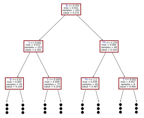 We suggested a mean squared error (MSE) as the index to perform recursive splits. Therefore, at lower layers, the MSE becomes gradually lower. The tree identifies B as a parameter to start splitting at the root node. Accordingly, a sample that satisfies criteria (B < 0.755) is moved to the left side, whereas the remaining samples are moved to the right side. The term ”value” represents the mean value of the dependent variable that passes through a box. Likewise, the trees continue splitting based on dominant features. For example, in the second level, the tree decides that Hs and S are the dominant features of predictions. At each box, the “IF-THEN” sequence is associated with the left arrow. On one hand, the tree separations are samples with a large variation. However, the tree becomes complex with depth. Therefore, it stresses the requirement for a post-hoc explanation (e.g., SHAP) to explain the inner-working methodology of the ML model.