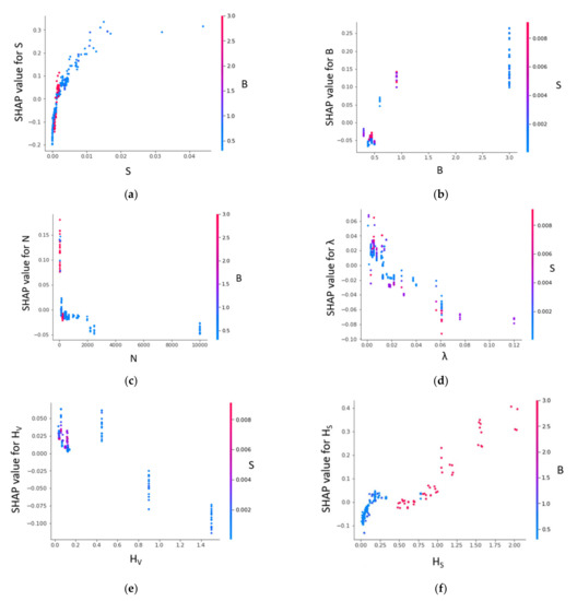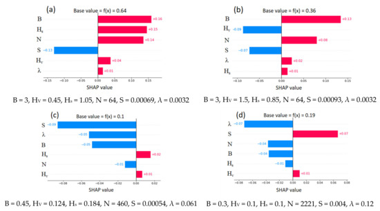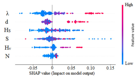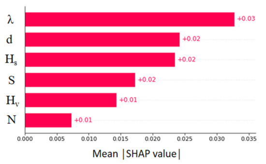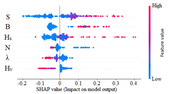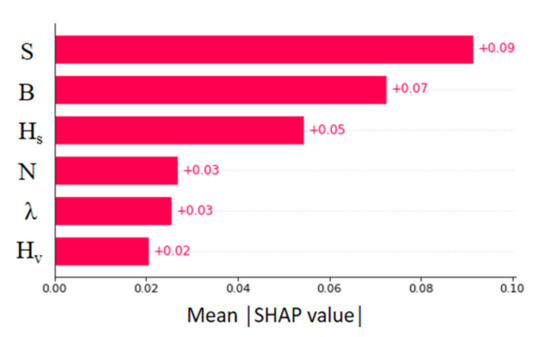Figure 12 shows the average mean absolute SHAP value for the overall UB predictions. Accordingly, the energy slope (S) has the highest impact on UB (+0.09). Next, the effects of channel width (B) and surface height (HS) are dominant in the variation of UB. Stems (N), vegetation density (λ), and vegetation height (HV) have a moderately lower impact on UB. The same explanation can be separated into instances to obtain a global explanation as shown in Figure 13.