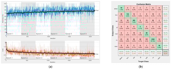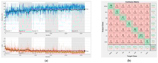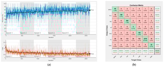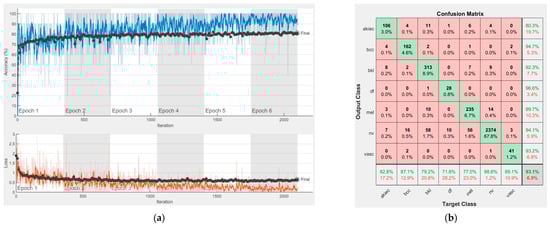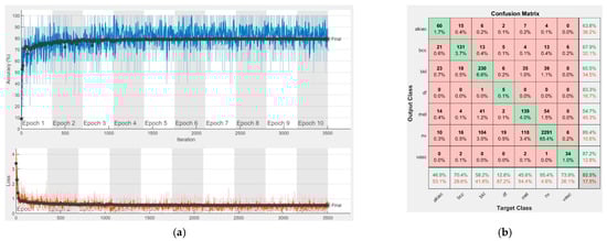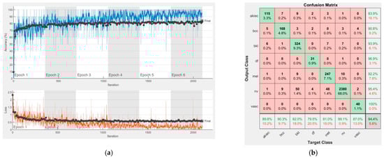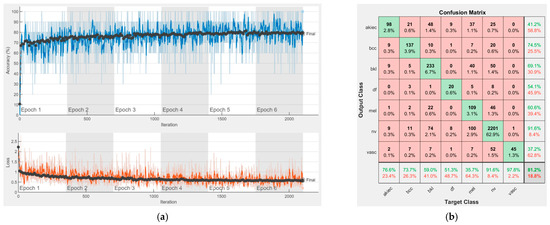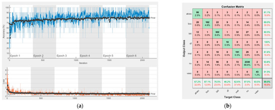 Results using AlexNet. (a) Accuracy and loss, (b) Confusion matrix.